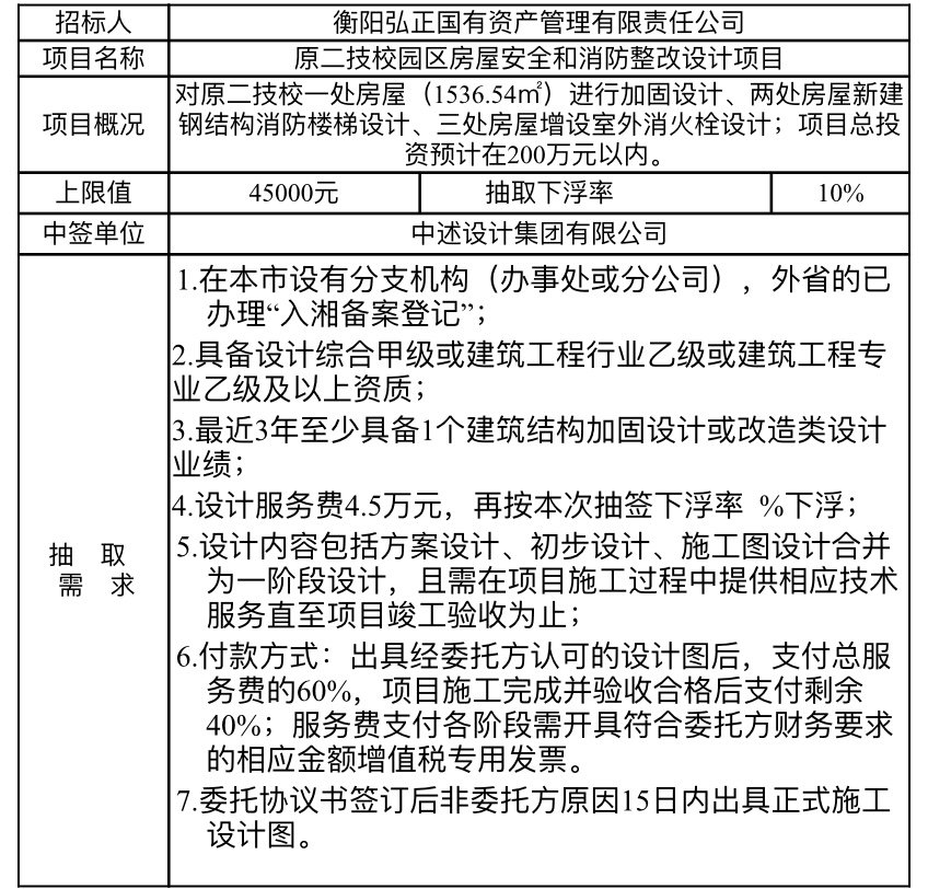 原二技校園區房屋安全和消防整改設計項目于2025年10月17日在衡陽(yáng)國投4棟3樓評標室進(jìn)行了隨機抽取,現將相關(guān)信息予以公示。
