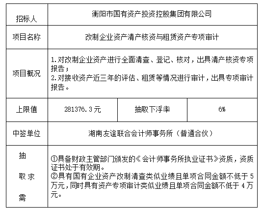 改制企業(yè)資產(chǎn)清產(chǎn)核資與租賃資產(chǎn)專(zhuān)項審計于2025年10月17日在衡陽(yáng)國投4棟3樓評標室進(jìn)行了隨機抽取,現將相關(guān)信息予以公示。