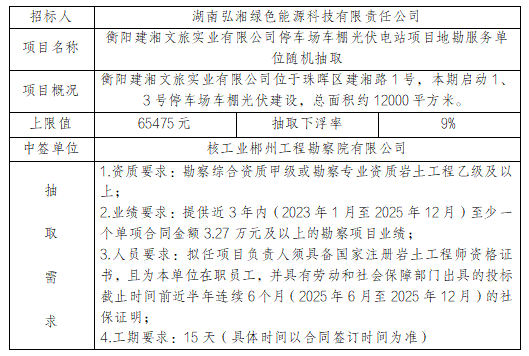 衡陽(yáng)建湘文旅實(shí)業(yè)有限公司停車場(chǎng)車棚光伏電站項(xiàng)目勘察服務(wù)隨機(jī)抽取結(jié)果公示